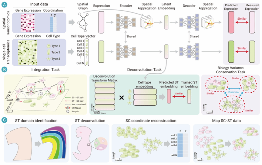 在生命医学研究中,精确解析细胞在组织中的空间分布与功能联系对于理解器官结构及疾病演进至关重要。单细胞转录组学(single-cell transcriptomics, SC)测序技术虽能描绘单个细胞的基因表达全貌,但导致原始空间位置信息丢失;而空间转录组学(spatial transcriptomics, ST)测序技术能够保留细胞的空间信息,却面临测序分辨率低或检测基因数量受限的固有技术限制。如何有效整合两者的技术优势,克服现有测序数据的局限性,是当前计算生物学亟待解决的难题。为了解决这些挑战,尚学群教授团队提出了基于多任务优化策略的深度神经网络框架(stSCI,图)。该方法通过设计异构数据融合模块,利用共享图注意力网络作为编码器,将多源异构的SC和ST数据投射到统一的、经批次校正的低维嵌入空间中。通过这种特征融合机制,模型在有效消除异构数据间技术差异与噪声干扰的同时,最大程度地保留了细胞间真实的生物学差异与拓扑结构特征。实验结果表明,模型在空间域识别、三维组织结构解析、细胞类型反卷积及单细胞空间位置重构等多个关键任务中,综合性能均优于现有主流方法。通过将该方法应用于沙门氏菌感染的小鼠结肠模型测序数据,研究团队不仅成功识别出关键的淋巴组织区域,还精准捕捉到该区域在感染过程中表现出的“延迟激活”动态响应模式,这一发现与已知的感染免疫动力学高度吻合。该工作为解析复杂组织微环境、理解疾病演进机制等生物学研究提供了高效的人工智能方法模型。